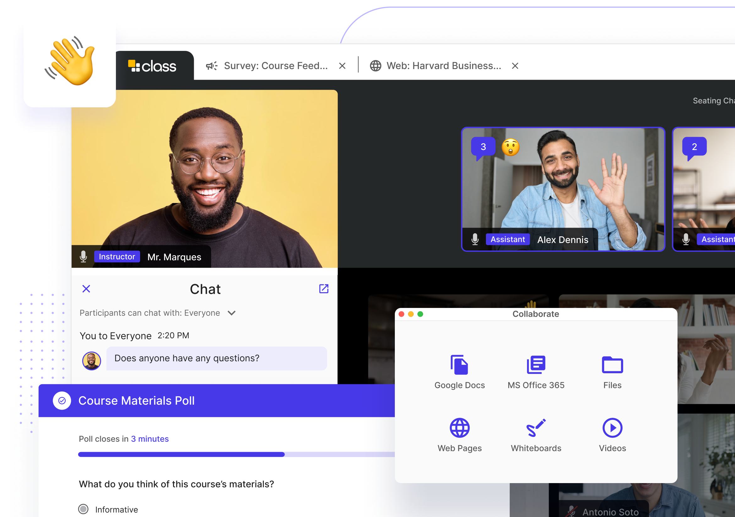 Human connection in learning doesn’t have to be lost behind a screen. It can be active, collaborative, and engaging for everyone, everywhere. With Class, you get instructor-led tools that help people learn through interaction, discussion, and exploration.