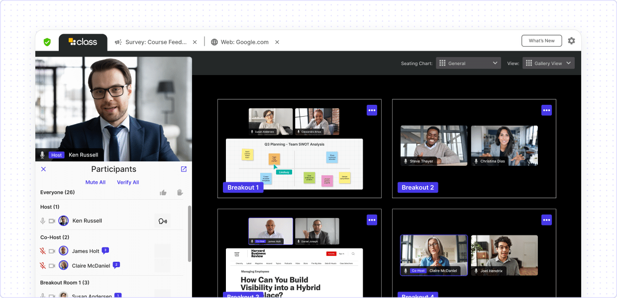 Class’s enhanced breakout rooms are uniquely designed to facilitate small group interactions and meaningful discussions—all while giving instructors increased visibility into group activities. Organize learners into small groups to boost engagement, spark effective collaboration, and ensure every learner can contribute to a dynamic, active learning environment.