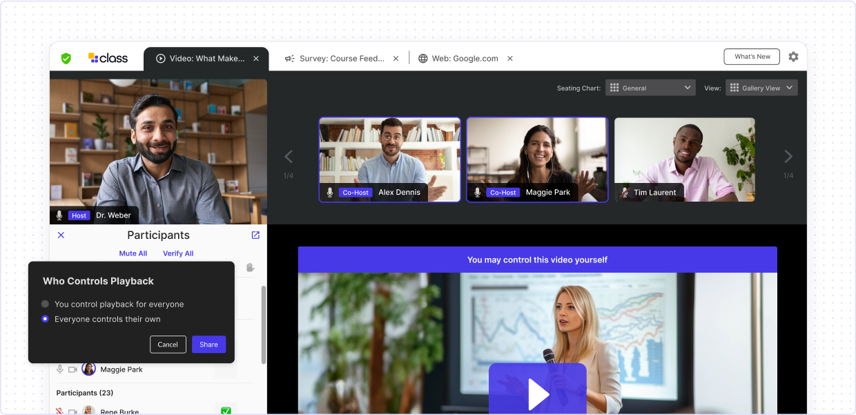 Bring lessons to life with interactive content sharing—files, videos, and media that everyone can share and view. Allow learners to actually interact with course materials and explore the content, all without leaving Class. Empower learners to digest materials at their own pace.