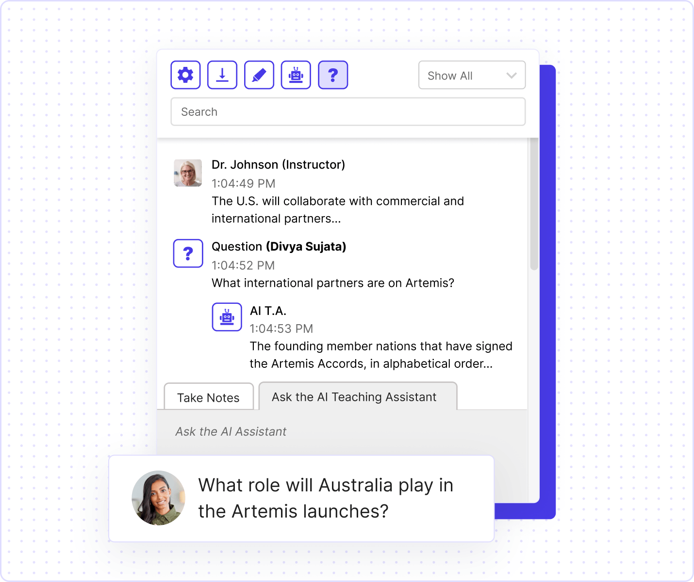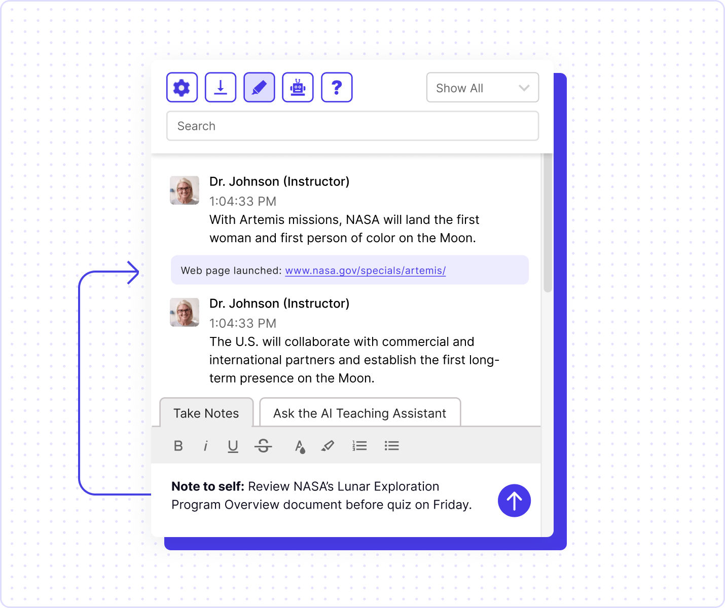 Enhance the learning experience—for instructors and learners alike—by providing immediate access to valuable information. With Class’s AI-powered assistant, instructors can keep courses on track while learners get the clarity they need.
