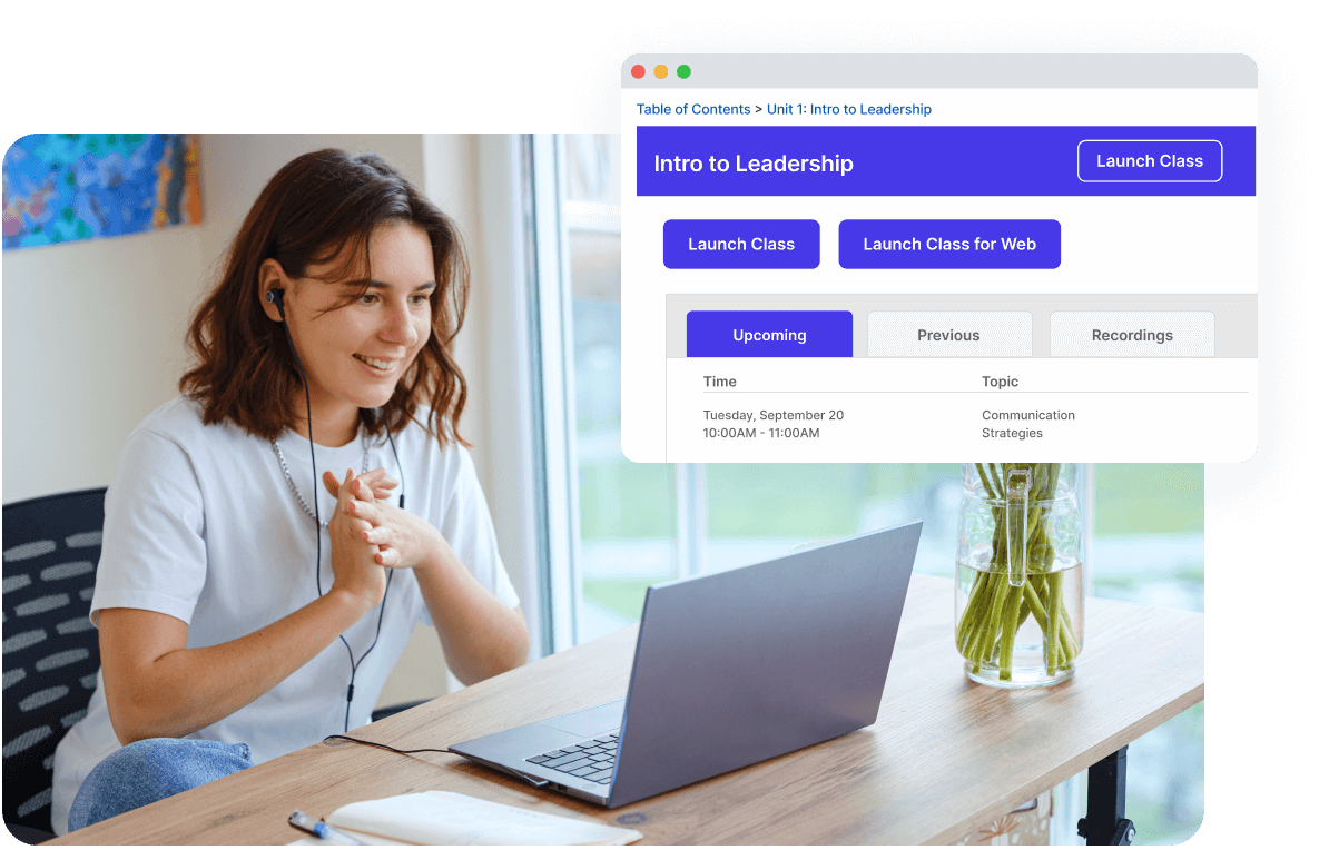 Zoom is a great resource for video conferencing. Class adds a complete virtual classroom solution that’s specifically designed for virtual learning. With Class you can build curriculums, integrate your LMS, and offer asynchronous, synchronous, and online learning.