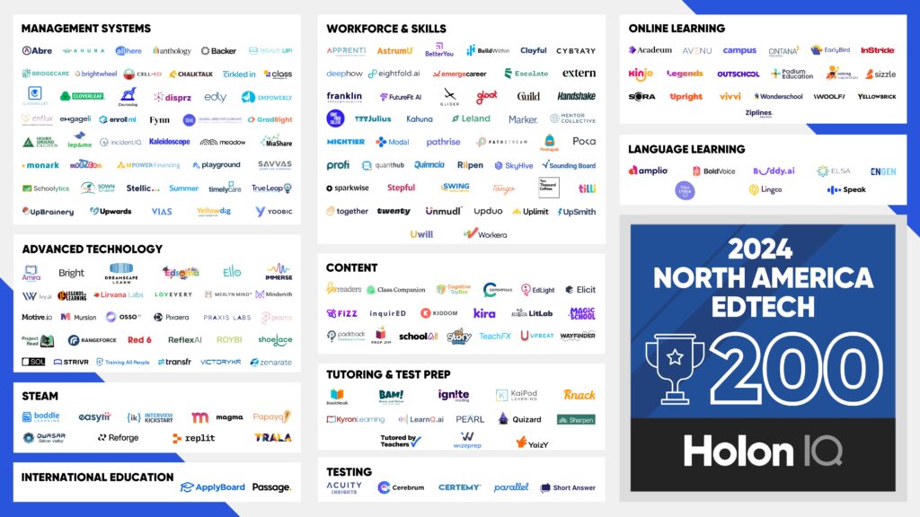 The North America EdTech 200 is HolonIQ's annual list of the most promising EdTech organizations from North America. This list focuses on identifying young, fast-growing, and innovative learning, teaching, and up-skilling organizations in the United States and Canada. Organizations are identified by data and insights from HolonIQ’s Impact Intelligence Platform, along with qualitative assessments by HolonIQ’s Intelligence Unit and local market experts in each region. Using this process, organizations are evaluated and scored.