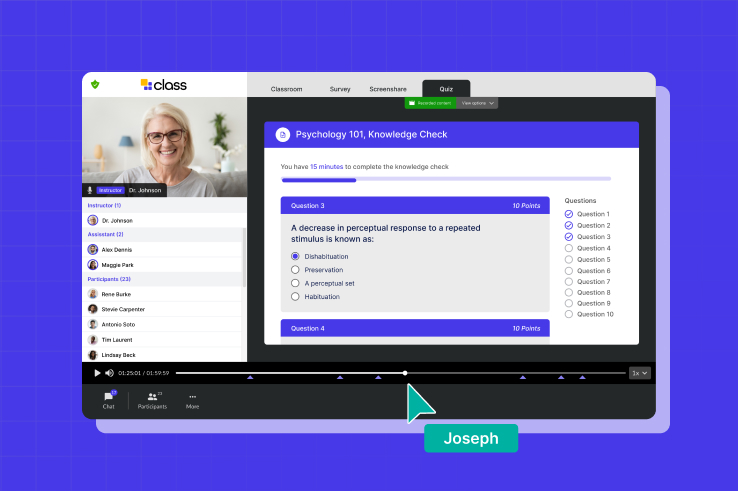 Class is built on the Zoom Meetings platform and provides everything needed to facilitate instruction and improve learner engagement in virtual and hybrid classroom settings. The software adds teaching and learning tools to Zoom that enable instructors to perform many of the activities that happen in a real classroom, virtually. Some key activities supported by Class include taking attendance, handing out assignments, giving a quiz or test, grading, proctoring exams, and talking one-on-one with a student.
