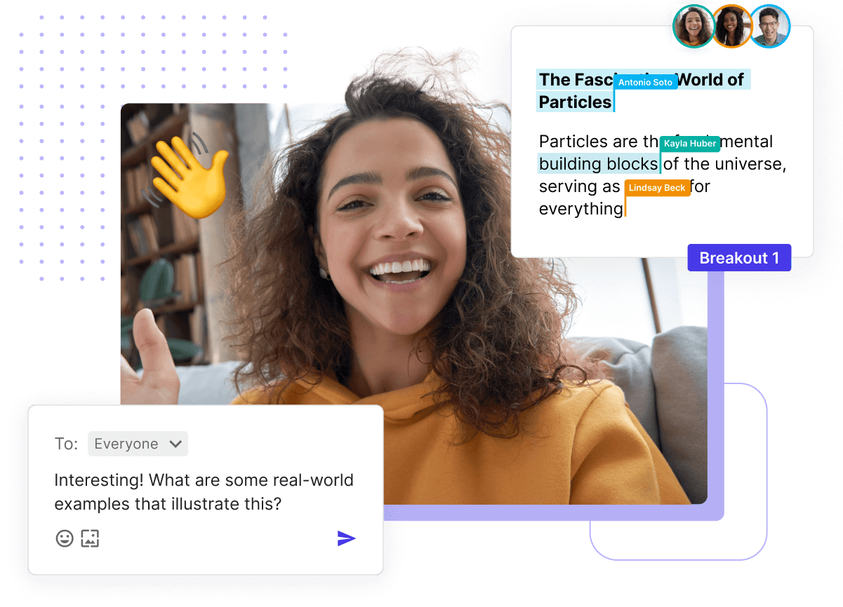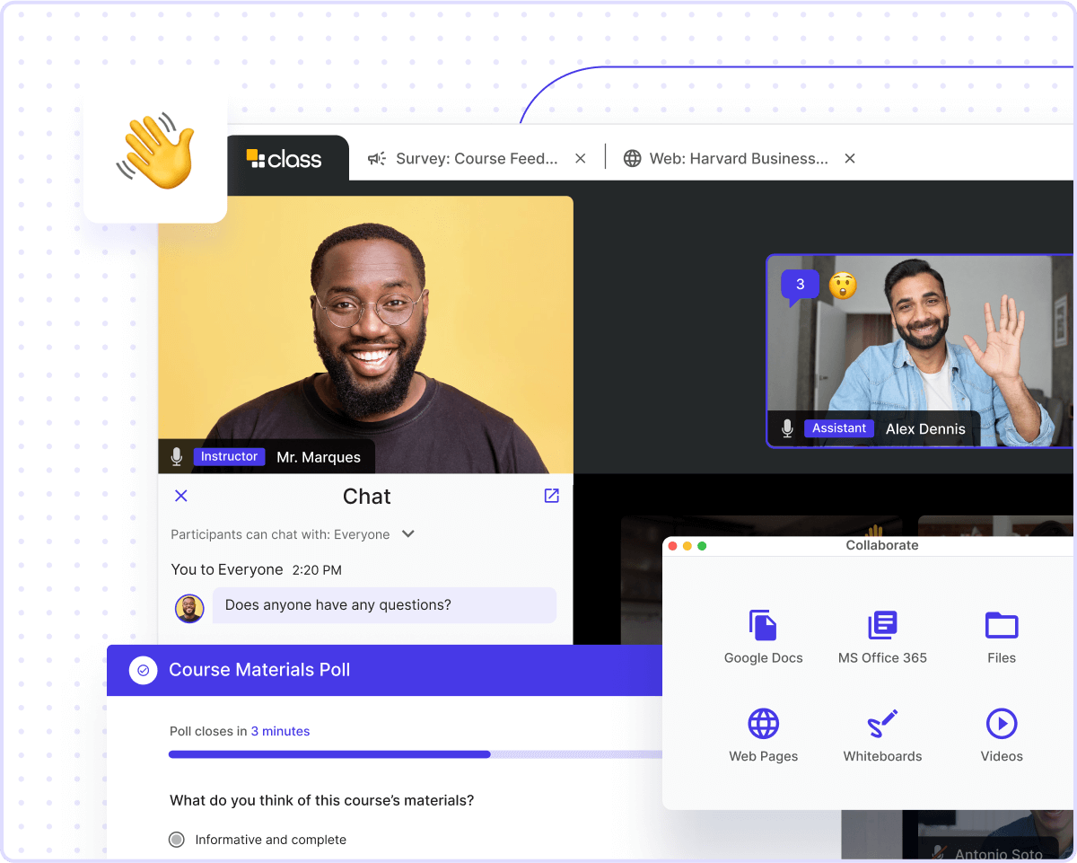 Haga que los estudiantes virtuales se sientan vistos, escuchados e involucrados. Con herramientas como las salas para grupos pequeños mejoradas y las pizarras didácticas, los estudiantes pueden interactuar con el material del curso como nunca antes. Fomente los debates, favorezca la colaboración y mejore la participación estudiantil. Class transforma el aprendizaje en línea sincrónico en una experiencia práctica e interactiva.