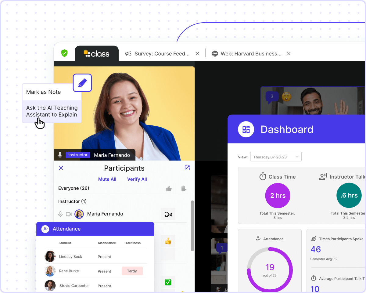 Class facilita el trabajo de los instructores con herramientas para optimizar la capacitación en línea. Tome asistencia, transcriba las sesiones y mida la participación, todo de manera automática. Vea los análisis en tiempo real mediante paneles de datos que son fáciles de leer y procesar.