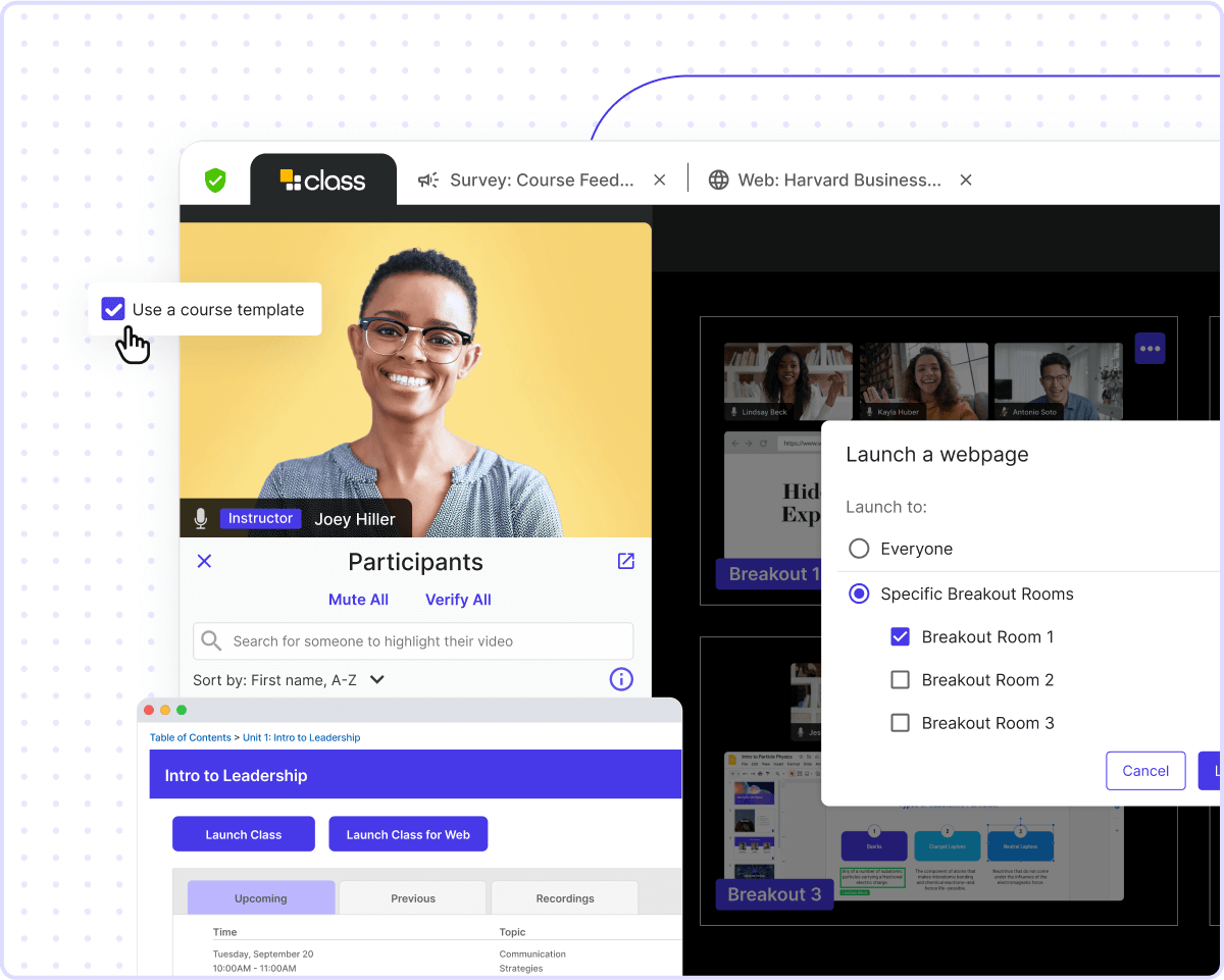 Deje de saltar de aplicación en aplicación y unifique todo en un solo espacio. Las integraciones y plantillas de cursos conectan el material con la enseñanza en vivo para garantizar que tenga todo lo necesario para brindar una experiencia de aprendizaje virtual completa y fluida.