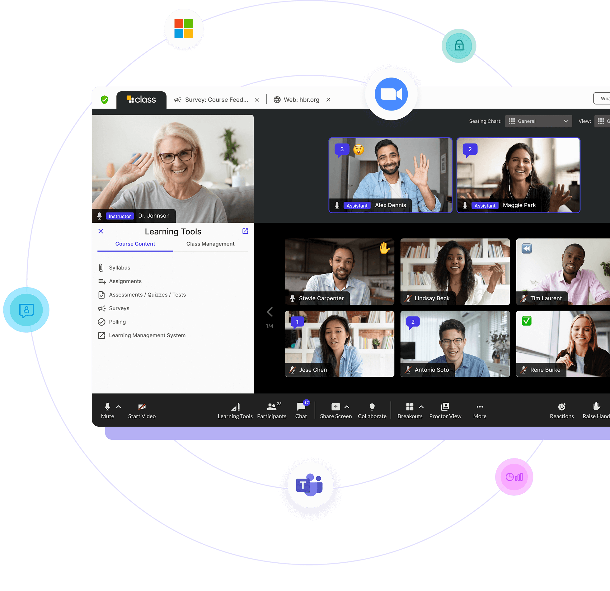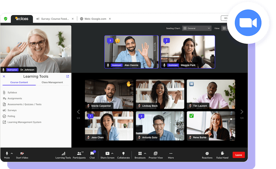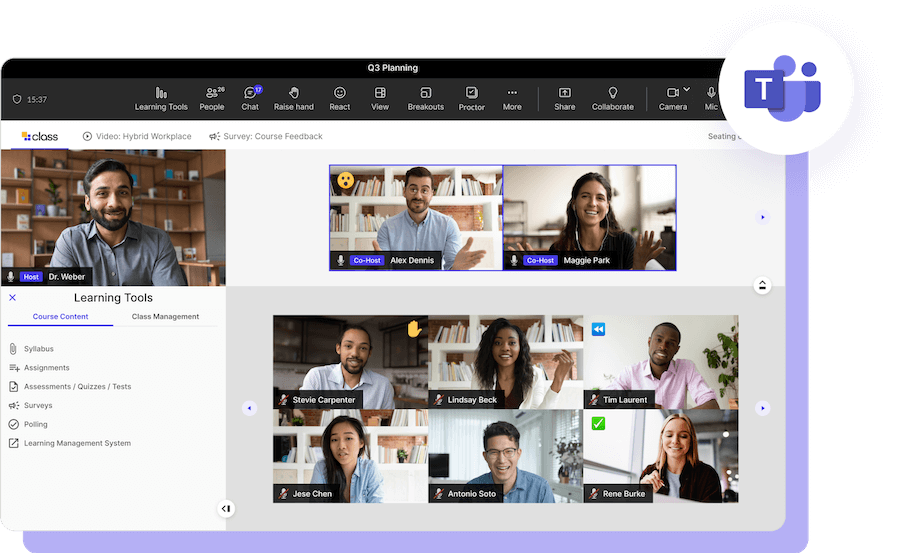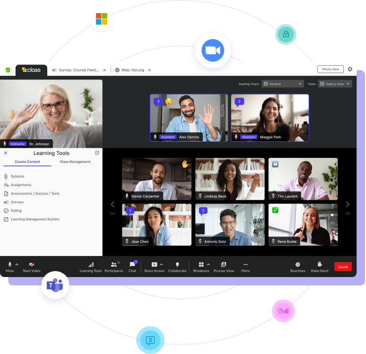 El aula virtual de última generación de Class aprovecha el rendimiento, la escala y la confiabilidad de las plataformas de video que son líderes en la industria: Zoom y Microsoft Teams.
