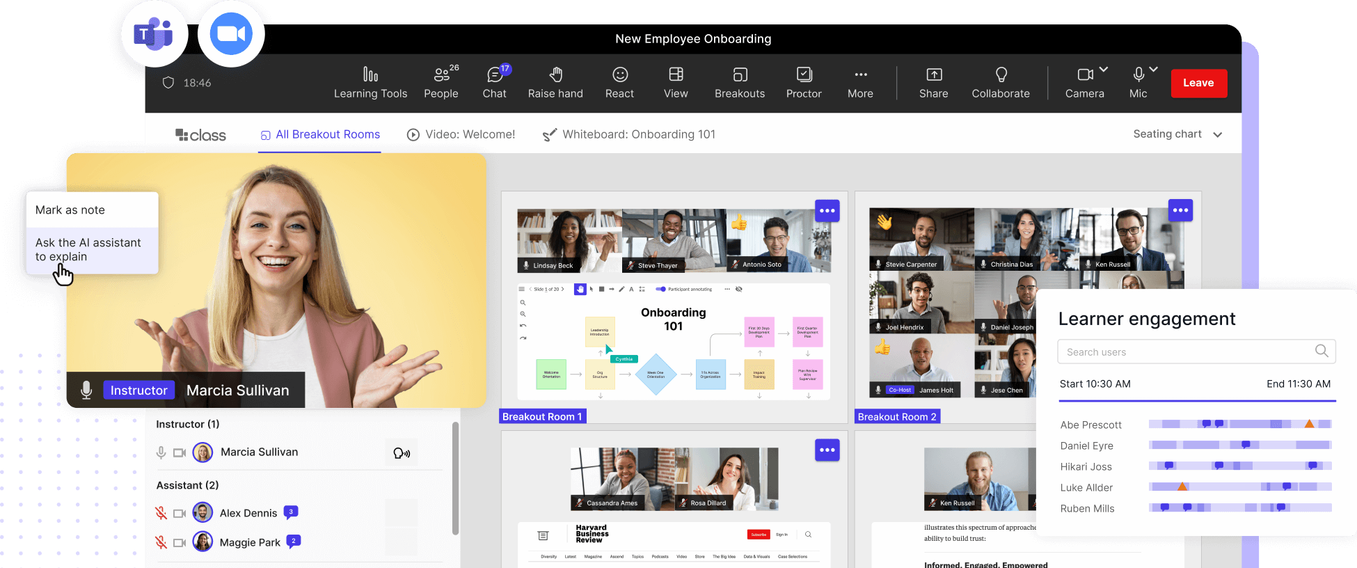 Enhance live instruction with embedded features designed for active learning. Monitor breakout rooms, guide individuals and measure their engagement in real-time.