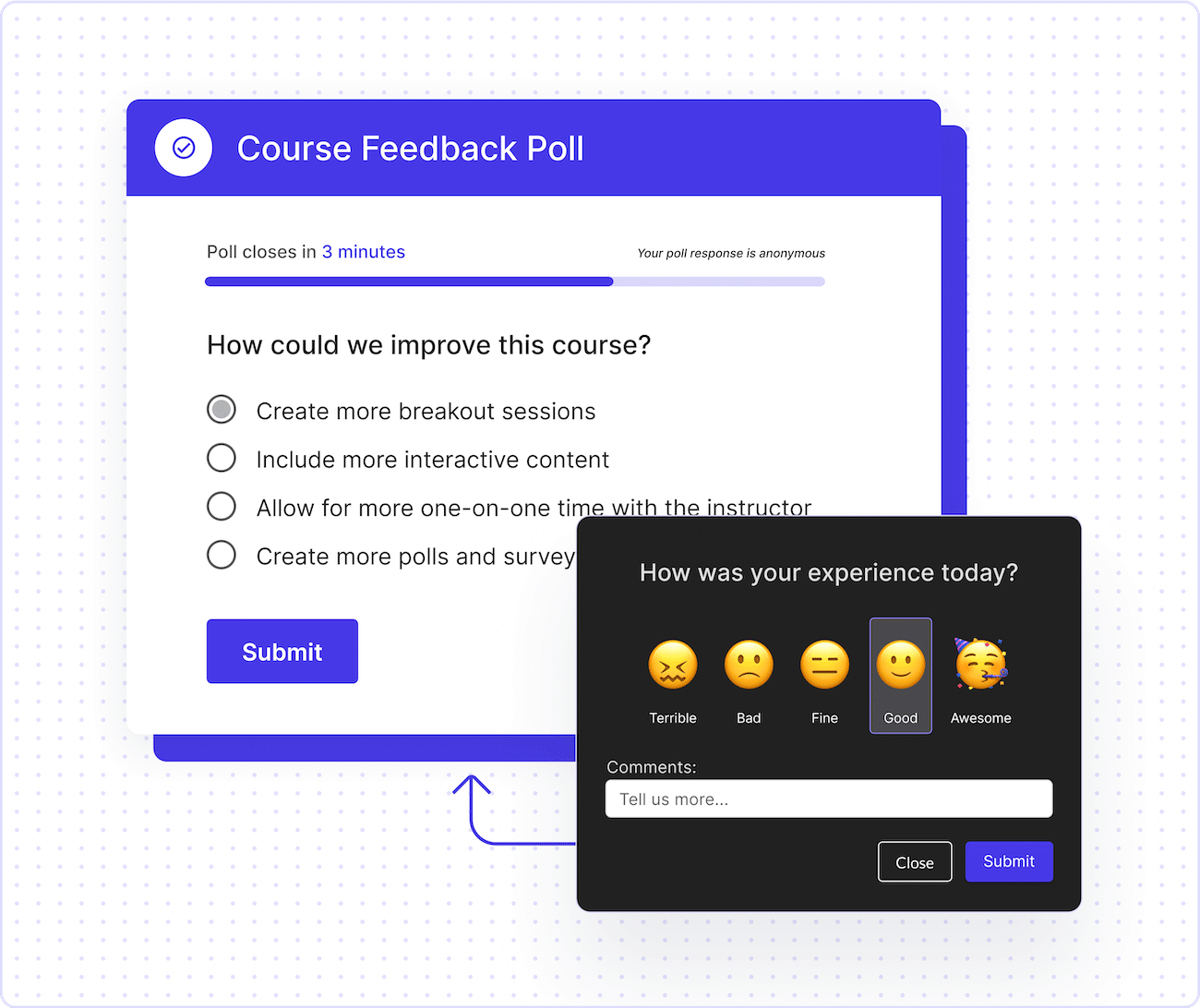 Gauge comprehension, build community, and encourage participants to voice their perspectives—making course sessions feel like a two-way conversation. Seamlessly capture real-time feedback and get participants involved to foster a culture of communication and continual improvement.