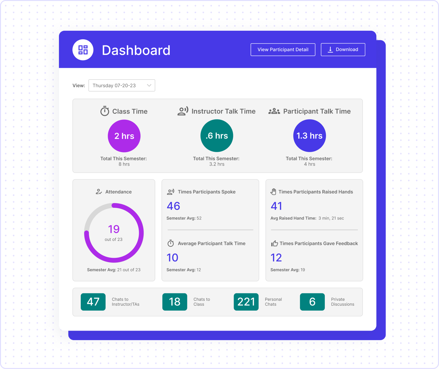 - View detailed metrics, including attendance, contributions, and focus levels