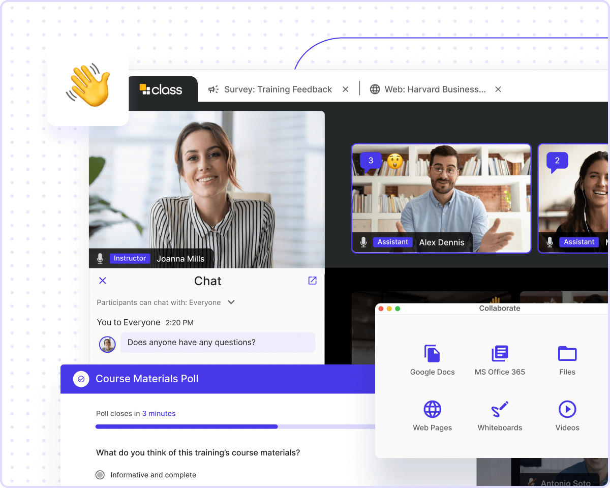 It’s hard to learn from just watching a screen. Class’s instructor-led tools empower learners to interact with course materials, connect with instructors and peers, and collaborate in a live, free-flowing virtual environment.