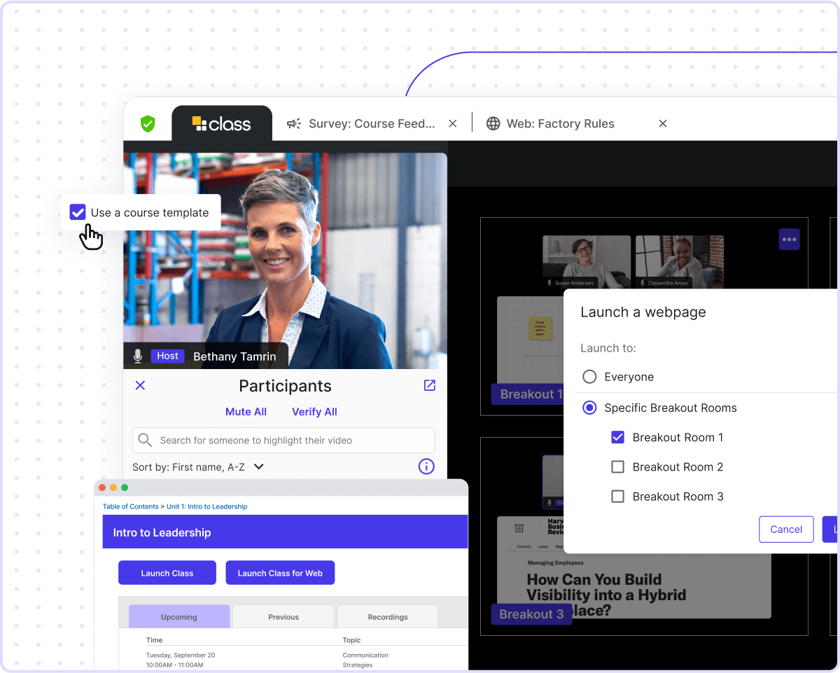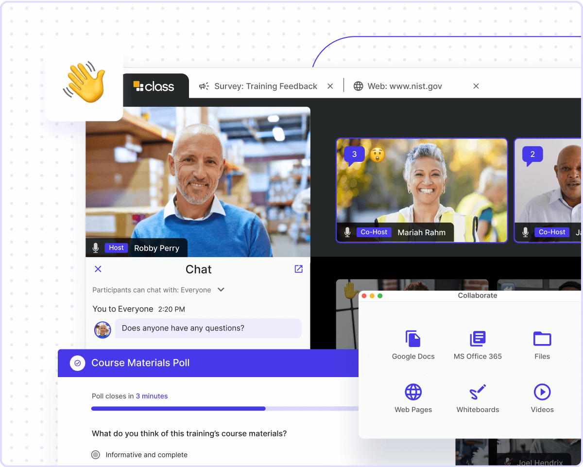 Class is an all-in-one virtual classroom that integrates deeply with your LMS to improve engagement, achieve compliance, and promote safety.